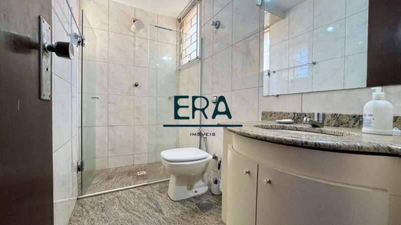 Banheiro social amplo com bancada em granito, espelho, armários e box em blindex